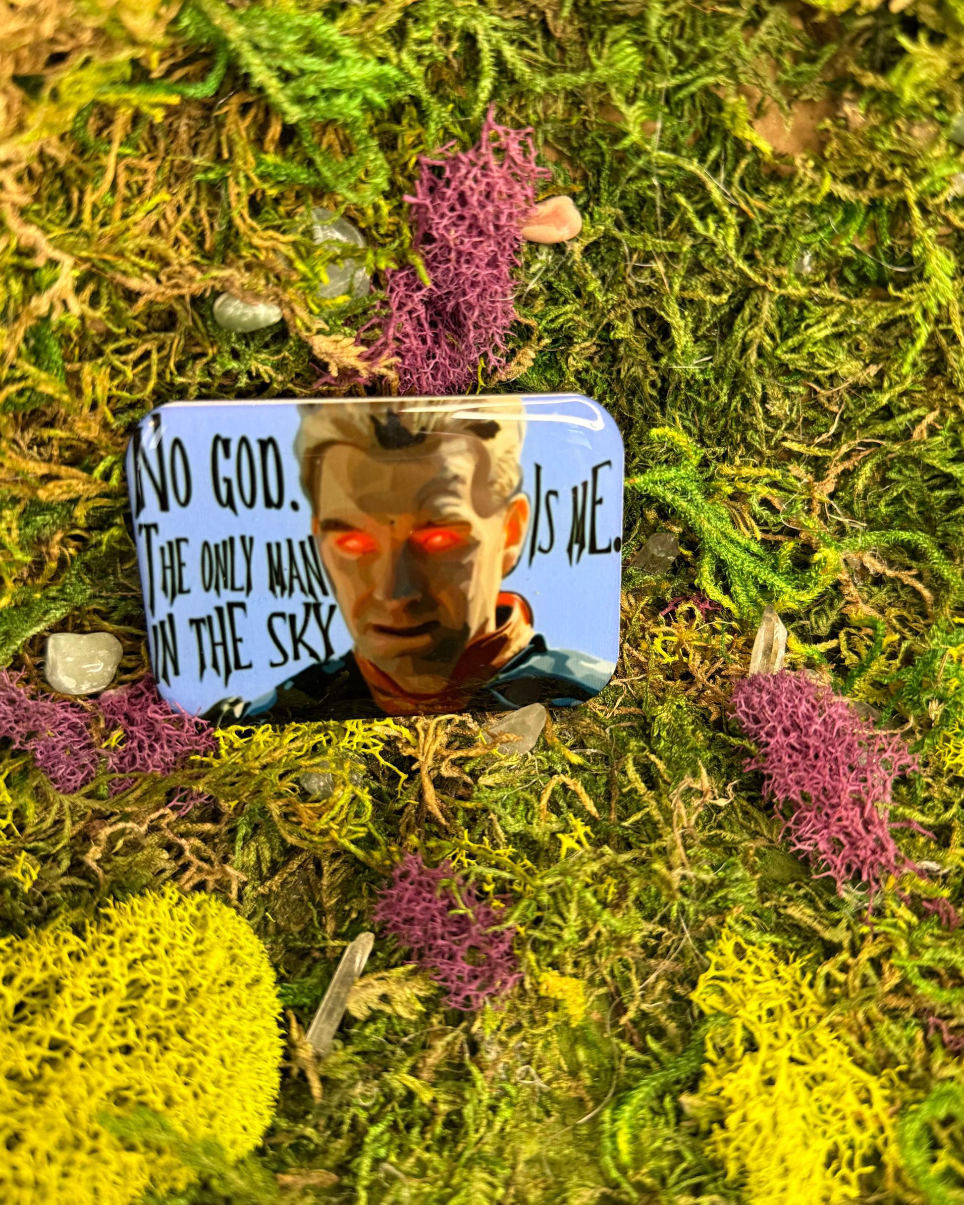 Stick this hand-drawn Homelander magnet on your fridge and let the most powerful (and unhinged) superhero from "The Boys" keep watch over your kitchen. This large magnet captures the character's intense charisma with artistic flair, complete with an iconic quote "No god. The only man in the sky is me." Perfect for devotees of the show's dark humor and morally questionable heroes, it's a bold statement piece that sparks conversations. Whether you're decorating your space or expanding your collection of edgy pop culture magnets, this design brings superhero attitude with a sinister twist. A must-have for anyone who appreciates antihero energy.